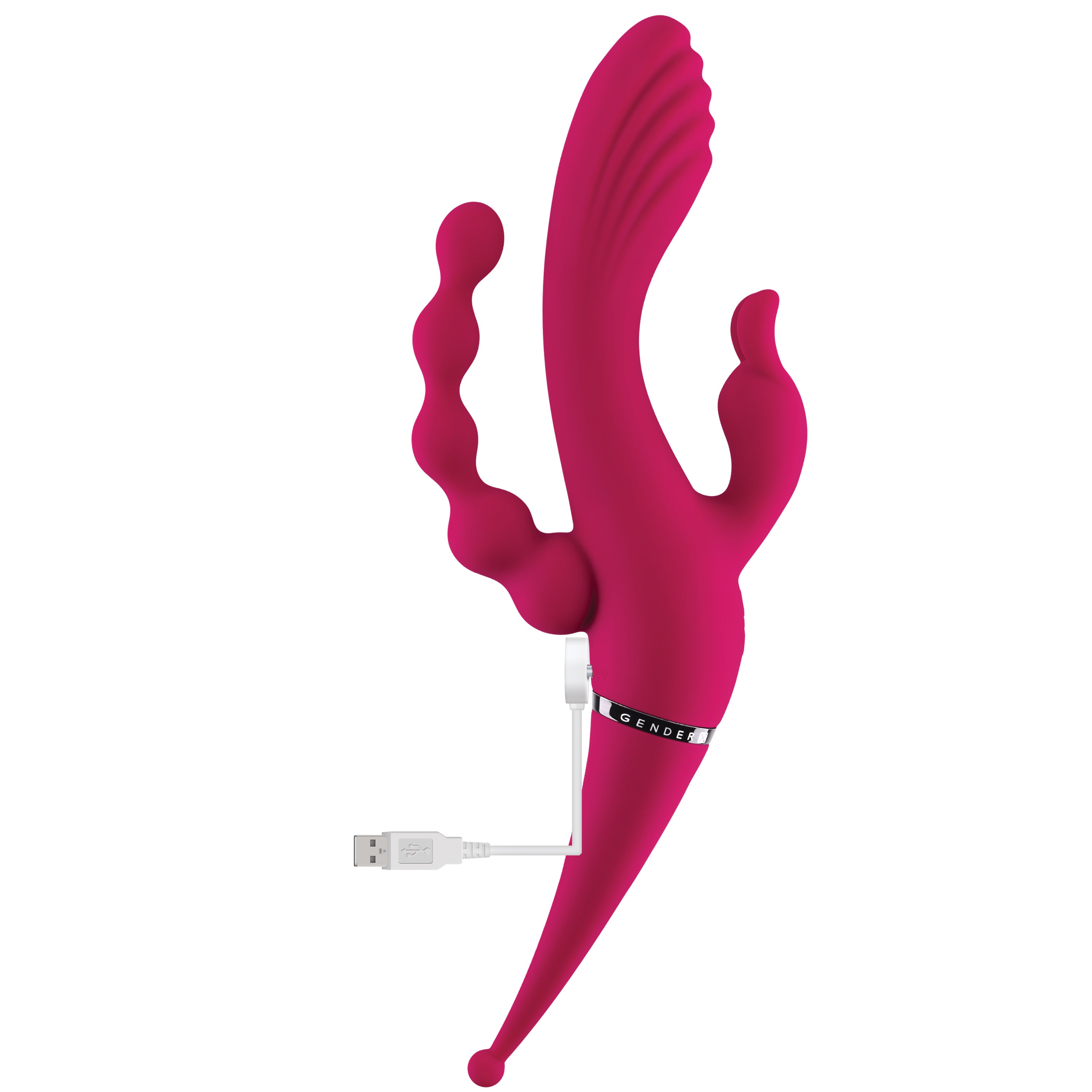 Emerging from either side are two more stimulators – a hard-working rabbit with buzzing ears and a chunky head, and a thin, curved beaded shaft that flexes easily to move with your body.