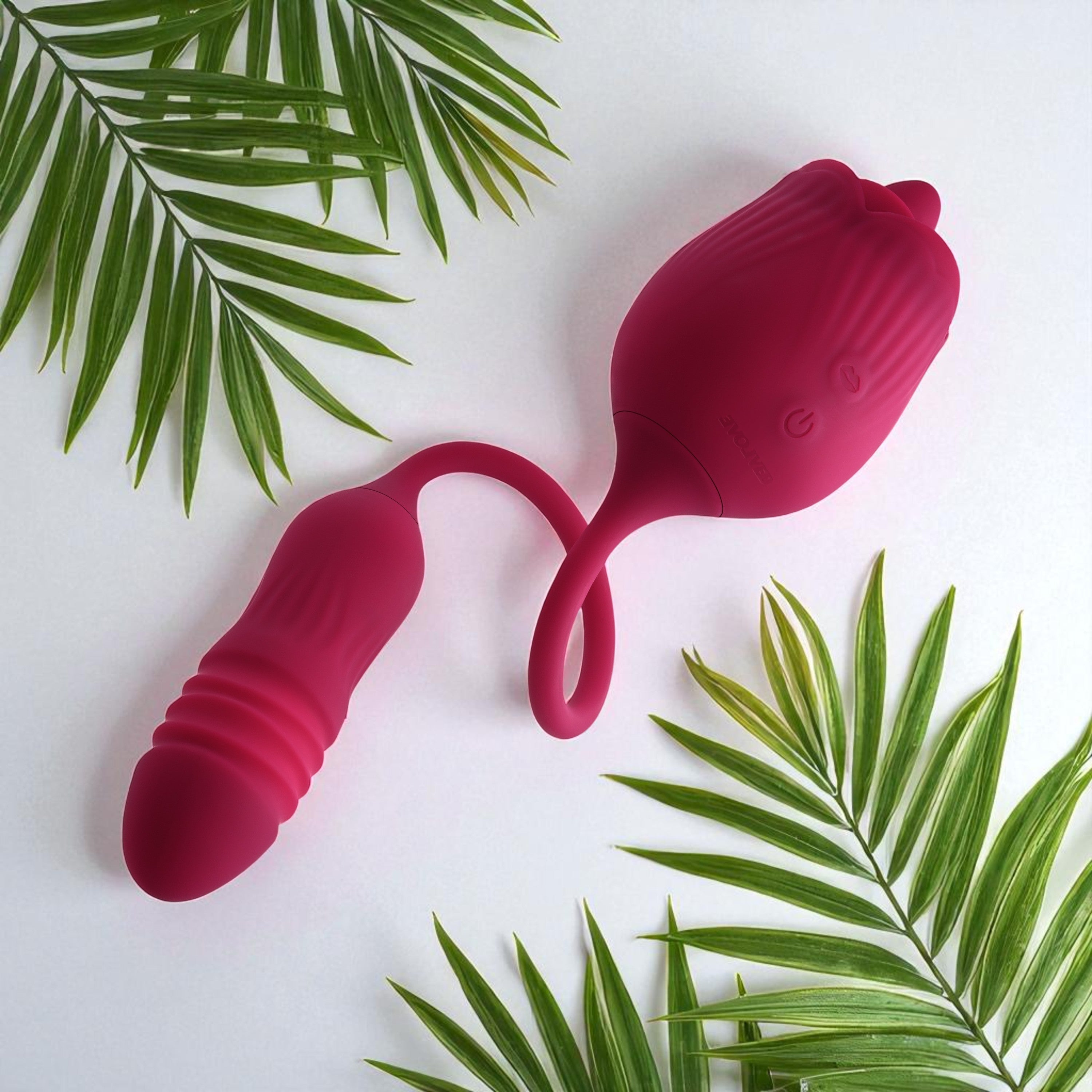 A textured, vibrating, thrusting bullet on one end ramps up to 10 speeds for a surprising spontaneous feel, while the velvet smooth rose at the other end surrounds a 10-speed vibrating, flicking tongue that targets with intensity.